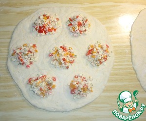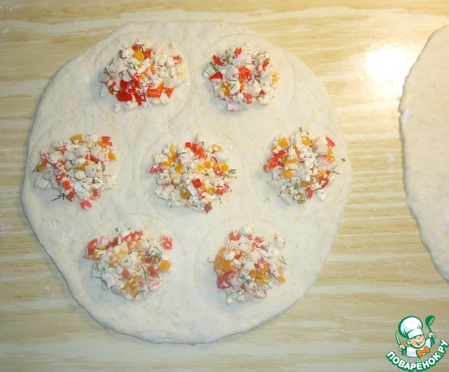 • Ранее подготовленную начинку выложить в середину каждого кружка.