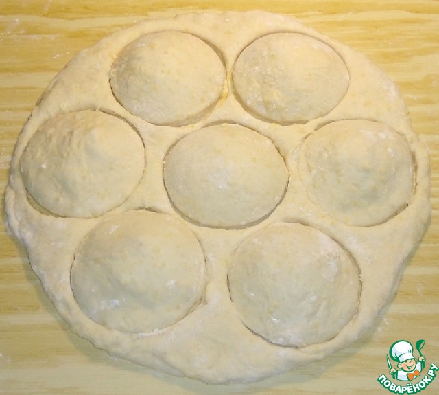 • Тесто разделить на 2 равные части и раскатать в пласты толщиной ~ 0,5 см. На одном пласте из теста выдавить не до конца кружки с помощью формы или стакана, от размера кружка будет зависеть размер булочек.