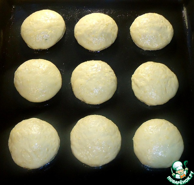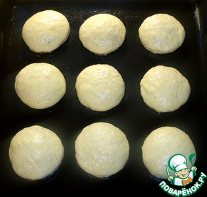 • Заготовки булочек выложить на противень, смазанный растительным маслом, и каждую заготовку смазать растительным маслом или яичным желтком. Выпекать булочки при температуре 180-190 градусов 20-25 минут.