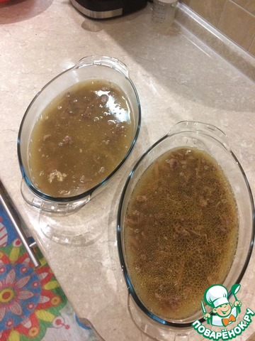 Разливаем процеженный бульон по судкам. На этом этапе он не будет особо прозрачным. У меня получилось полноценных 11 судочков и 2 баночки с юшкой (люблю её больше чем мясо). Остужаем до комнатной температуры и отправляем в холодильник.