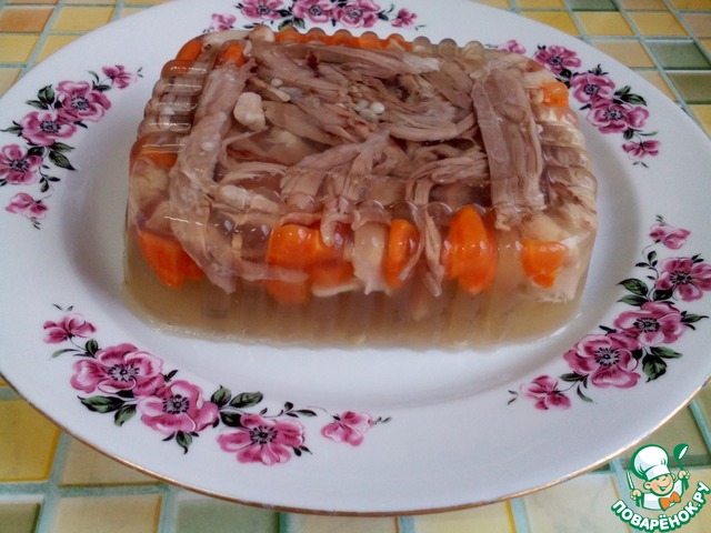 Знаю, знаю. Мой вариант холодца - 38-й по счету. И все же, я рискну. Для меня идеальный холодец: нежирный, только с кусочками мяса (безо всяких других запчастей вроде хрящиков, кожицы, косточек) и, конечно, прозрачный, как слеза. А ещё - никакой свинины, желатина и куриных лап (их я вообще в руки брать боюсь:))). Именно такой холодец варит моя мамуля. И научила меня. Если употреблять его без фанатизма, штука весьма полезная. Холодец содержит много белка коллагена, который замедляет процесс старения, обновляет клетки и борется с морщинами. А также: повышает подвижность суставов, улучшает кожные покровы и укрепляет кости, содержит витамины группы В, способствует усвоению кальция и укреплению иммунитета, улучшает состояние зрительного нерва.