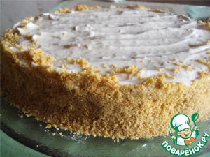 Верх и бока смазать кремом и обсыпать песочной крошкой (измельчить обрезки от коржей).