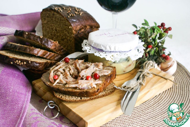 * У меня просто холодный бутерброд из бородинского хлеба с утиным конфи и ягодами брусники.