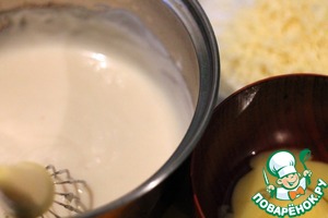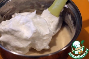 Потом аккуратно ввести желтки, соль и перец. Все немного взбить, добавить сыр и измельченный чеснок, перемешать и выложить в массу взбитые до устойчивых пиков белки. Аккуратно перемешать.