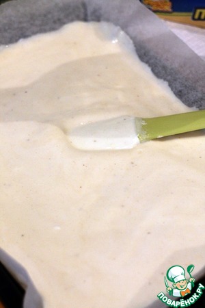 Духовку разогреть до 180 градусов. Противень застелить пергаментом, немного смазать маслом и вылить тесто. Разровнять и отправить в духовку на 30-40 минут.