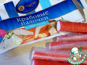 Для начинки: крабовые палочки разморозить и снять обертку.