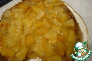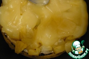 • Дно формы промазать маслом. Ананасы ровным слоем выложить на дно, сверху разложить ананасовый крем.