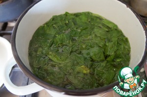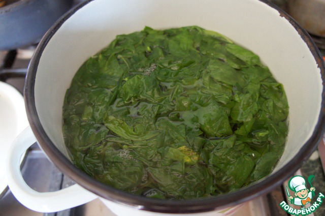 Шпинат отварить в подсоленной воде, откинуть на сито и отжать.