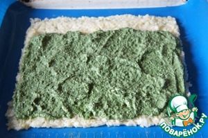 Противень застелить пекарской бумагой, смазать ее маслом. Выложить рисовую массу слоем примерно 26х23 см, толщиной около 1,5 см. Сверху выложить шпинатную массу и разровнять. Поставить противень в горячую духовку и испечь в течение примерно 20 минут.