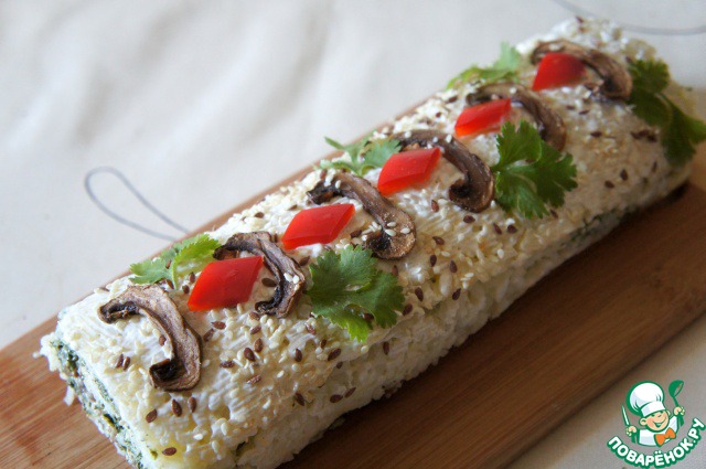 Слегка смазать рулет майонезом, посыпать кунжутными семечками и украсить.