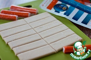 Слоеное тесто разморозить, немного раскатать в длину и нарезать на полоски чуть шире, чем крабовая палочка. Длина теста должна составлять 2 длины крабовых палочек. Из одного пласта теста у меня получилось 12 заготовок для слоек