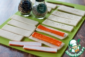 Крабовые палочки разрезать по длине на две половины. Я переживала, что с целой палочкой слойки получатся слишком объемные, как оказалось, вполне можно было и не разрезать крабовую палочку, а оставить ее цельной. Выбирайте сами, какой вариант вам больше нравится. Нижние полоски посыпать специями или смазать кетчупом. Если планируете подавать их в качестве закуски к пиву, специи надо выбирать поострее, например, табаско или хлопья чили, количество соли также можно увеличить. Я посыпала слойки итальянскими травами и лимонным перцем.