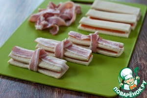 На палочки положить еще одну полоску теста, обернуть полоской бекона посередине и завязать его узлом. Хвостики бекона расправить сверху, по длине полоски теста.