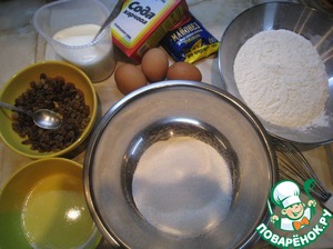 Вот все необходимые ингредиенты (ванильный сахар забыла сфоткать))) Изюм я уже приготовила заранее - залила теплой водой, дала постоять и слила ее, чтоб он обсох. Масло растопила.