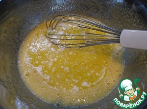 А мы тем временем яйца с сахаром и ванильным сахаром. Добавляем растопленное масло. Перемешиваем. Можно взять больше масла, грамм 80 - будет еще вкуснее, но тогда больше муки нужно будет.