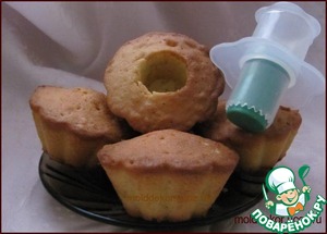 Плунжером для капкейков делаем отверстия (плунжер поставить на середину кекса и медленно вдавливать с прокручиванием по часовой стрелки до упора). Именно для этого кекса подошла только силиконовая форма - стаканчики (высота 4 см; диаметр верха 7,5 см, диаметр низа 4 см).