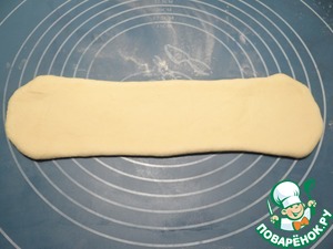 Затем с помощью скалки раскатываю полосу теста, чуть шире ломтика бекона.