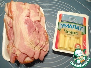 Для начинки я использовала ломтики бекона (не совсем тонкие ломтики, которые продаются в вакуумной упаковке, а купила в магазине кусок и попросила его нарезать на слайсере) и вот такой вкусный сыр Чечил соломкой.