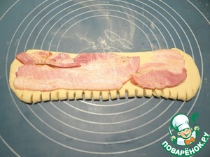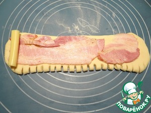 Кладу на полоску теста бекон (я брала один целый ломтик и еще кусочек).