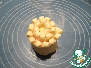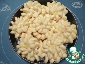 Смазываю форму растительным маслом, равномерно укладываю "цветы" из теста.