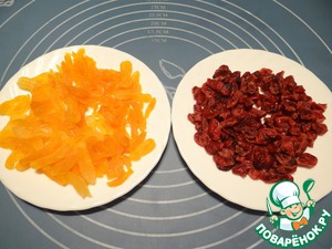 Я готовила пирог с двумя видами добавок - курагой и сушеной клюквой. Курагу мою и мелко нарезаю.
