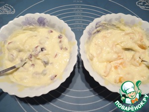 Остывшую начинку из сливочного сыра делю на 2 части, в одну добавляю курагу, в другую сушеную клюкву.