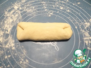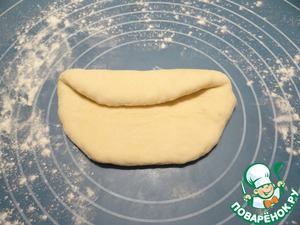 Используя муку для подпыла, раскатываю из одного кусочка теста небольшой круг. Загибаю сверху часть теста к середине.