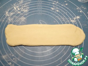 На полосу из теста кладу начинку и с помощью ложки распределяю ее по всей длине, отступая от края примерно 1 см.