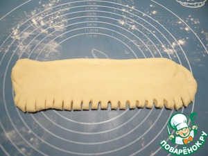 С помощью ножа делаю надрезы по краю полосы из теста примерно через 0,7-1 см.