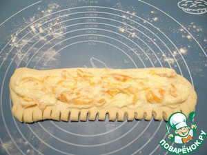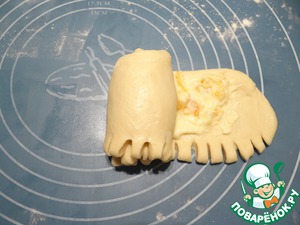 Сворачиваю тесто рулетиком. Защипываю край полоски. Таким образом формую 4 "цветка" с начинкой с добавлением кураги и 4 с сушеной клюквой.