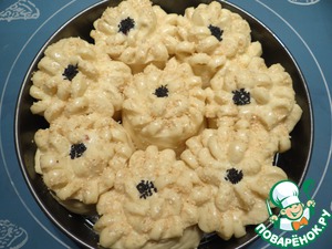 Серединку каждого "цветка" посыпаю черным кунжутом, остальное тесто посыпаю белым кунжутом.