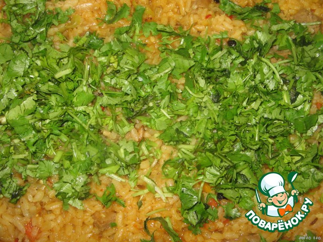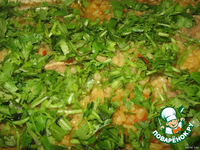 Накрываем крышкой. Больше мы её не открываем до готовности. На большом огне варим 10 минут, на среднем - 10 минут, меньше - 5 минут, ещё меньше - 5 минут. Выключаем огонь и даём постоять минут 20. Открываем крышку и сразу посыпаем мелко нарезанной зеленью (у меня была кинза и петрушка).