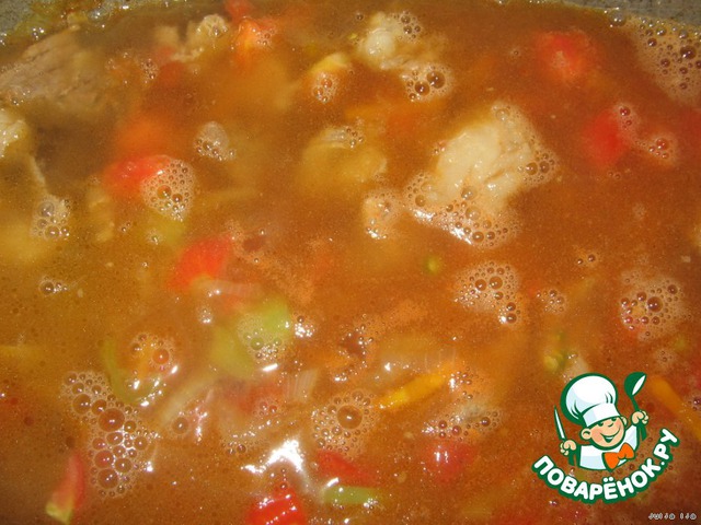 Нарезаем лук, морковь и перец соломкой, добавляем к обжаренному до полуготовности мясу.