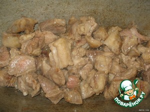 Нарезать мясо небольшими кусочками. Отдельно о посуде: у меня гусятница, но можно использовать и кастрюлю, главное, чтобы стенки у посуды были толстые. В идеале это казан. В разогретой гусятнице обжариваем мясо, сначала то, которое пожирнее, чтобы жир вытопился.