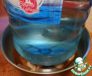 И поставить под гнет на ночь (у меня была 5-литровая банка с водой).