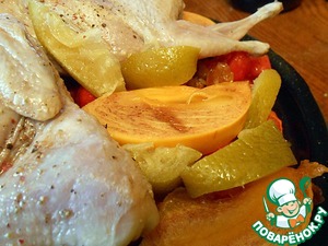 Между тушками перепелов положить дольки хурмы (косточки предварительно извлечь).