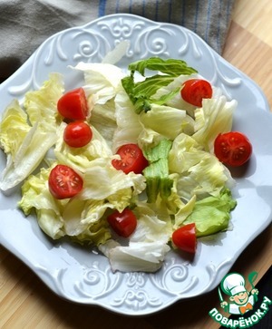 Салат готовим прямо в тарелках, в которых будет подавать. Салат нарвать крупными кусками, помидоры черри нарезать на половинки, выложить их на салат.