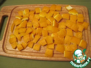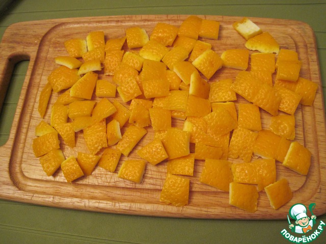 Заранее сделаем цукаты из апельсиновых шкурок. Тщательно вымоем апельсины, срежем кожуру, как можно тоньше оставляя белый слой, нарежем на кусочки, положим в воду на сутки, чтобы ушла горечь. Воду меняем каждые 3-4 часа.