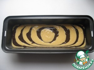 Берем форму. У меня прямоугольная. В центр наливаем 3 ст. л. шоколадного теста, затем 3 ст. л. белого. И так, чередуя слои, выкладываем все тесто.