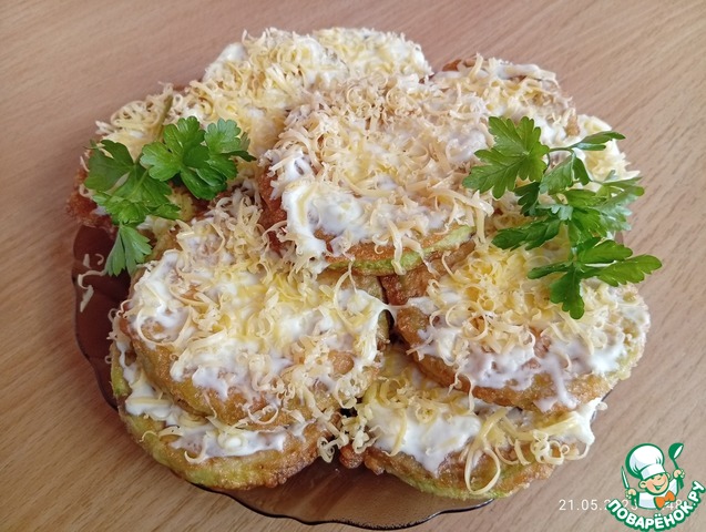 Можно запечь или пожарить кабачки кружочками, выстелить их на тарелку, слегка смазать майонезом и посыпать сыром. Угощайтесь!