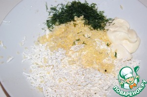 Творог протереть через сито или измельчить в блендере, добавить тертый сыр Эдем, чеснок, соль, перец, майонез, 1 ст. л. укропа и хорошо перемешать.