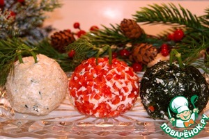 Нежная, в меру пикантная, нарядная закуска из творога и сыра Гауда, приправленная майонезом и чесноком, может иметь довольно разный вкус, потому что все зависит от того, чем покрыты наши новогодние игрушки!