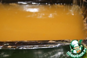 Налить на дно тонкий слой бульона и поместить в холодильник. Дать полностью застыть.