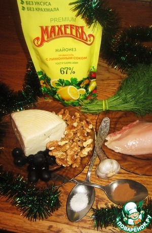 Смешать немного орехов вместе с грудкой, чесноком, зеленью и сыром, добавить по вкусу соль и перец. Добавить 2 столовые ложки майонеза и хорошо все перемешать.