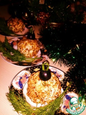 Обвалять их в орехах, сверху положить половинку маслины и в нее поместить в виде петельки веточку от зелени!