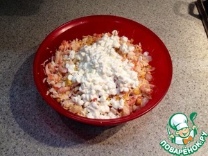 • Добавить кукурузу и зернистый творог, предварительно слив с них жидкость. Я думаю, что вместо творога можно использовать не очень соленую брынзу или творожный сыр.