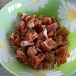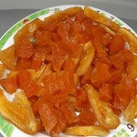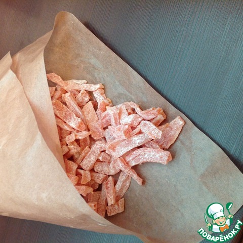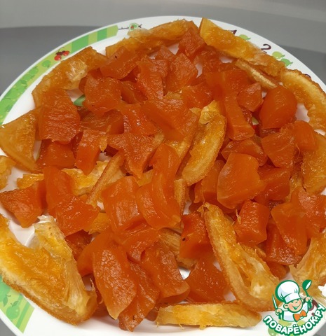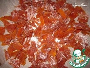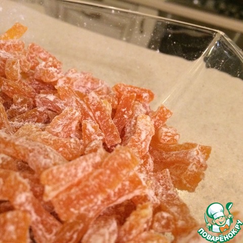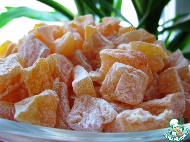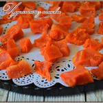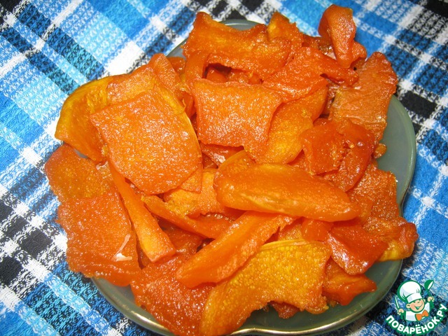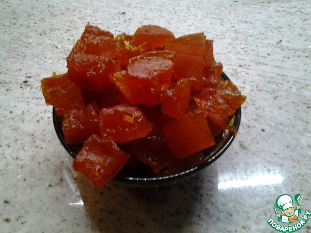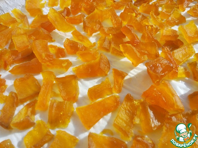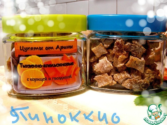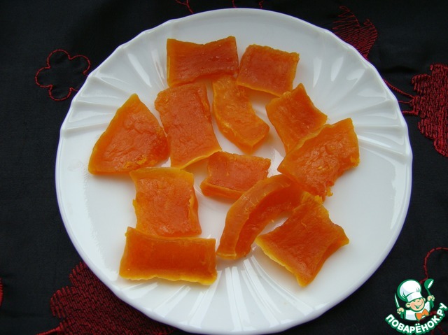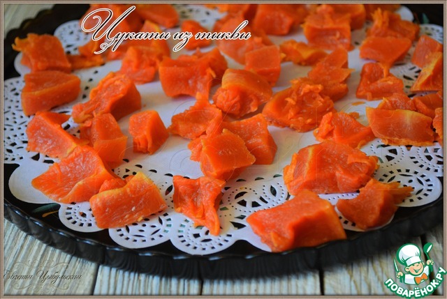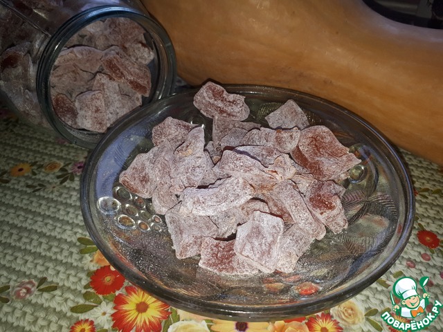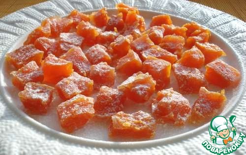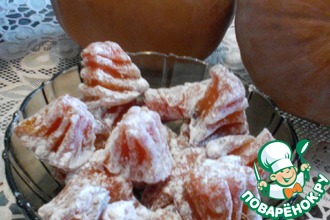 Рецепт цукатов- просто супер! Апельсина не было- положила лимон. Сахар уменьшила ровно в половину, добавила сушеной мяты. Варила 2 раза ( боялась, что замороженная развалится вся). Сушила в дегидраторе. В сахарной пудре не обваливала. Дети даже не догадались, что это тыква. Очень вкусно! Спасибо за рецепт!