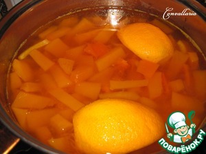 В большой кастрюле сварить сироп из сахара и воды. В сахарный сироп добавить тыкву, корицу, гвоздику. Из апельсина выжать сок и вместе с цедрой так же добавить в сироп. Довести до кипения, варить 5 минут, снять кастрюлю с огня, охладить до комнатной температуры. -