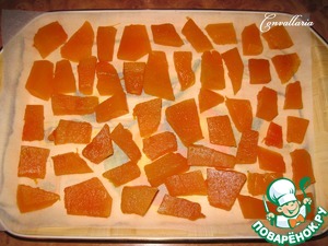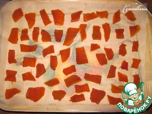 Затем выложить кусочки тыквы на пергамент для выпечки и высушить в духовке при 50 градусах с вентилятором.