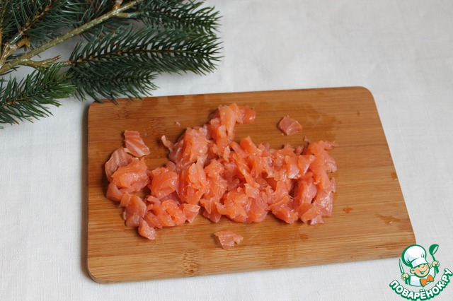Рыбу нарежем мелко. Примерно 100гр. Остальную оставим для украшения.